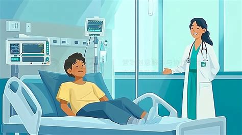 表情平静AI数字艺术-青少年生病简约卡通风医生护士青少年病人医院病房微笑问候插画-AI平面元素