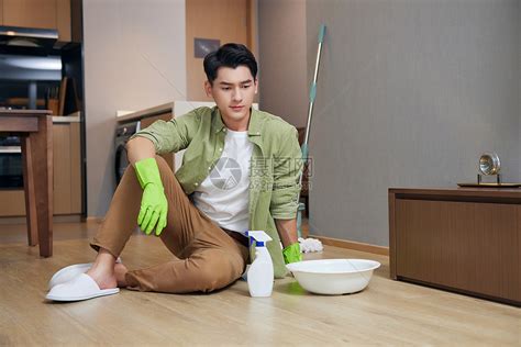 年轻男青年居家打扫卫生疲劳表情高清图片下载-正版图片501803528-摄