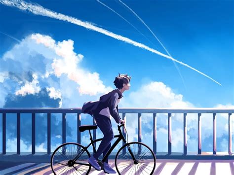 少年骑行于云端桥上,蓝天白云相伴尽显清新自由 平板壁纸|夏日插画风