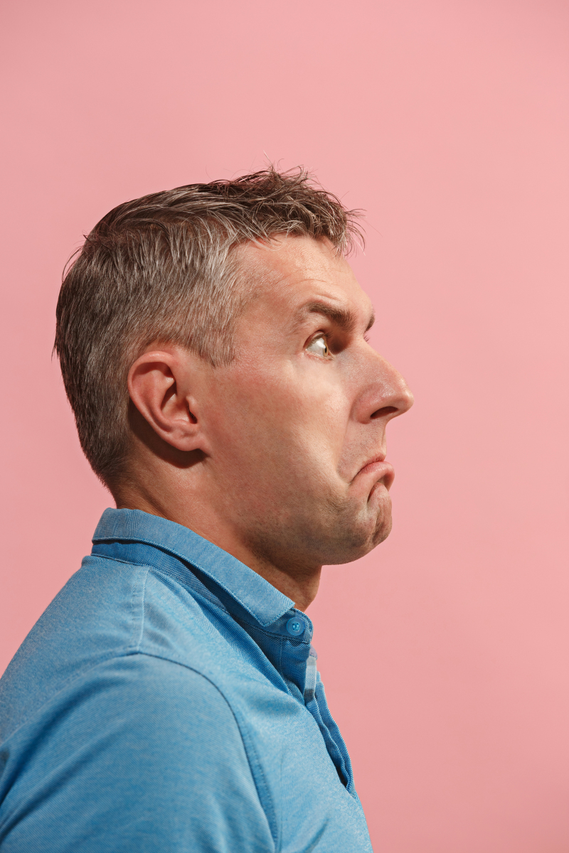 略带悲伤的表情,微微皱眉